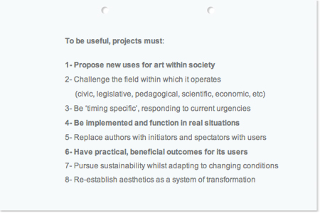 The notion of what constitutes Arte Útil has been arrived at via a set of criteria that was formulated by Tania Bruguera and curators at the Queens Museum, New York, Van Abbemuseum, Eindhoven and Grizedale Arts, Coniston.