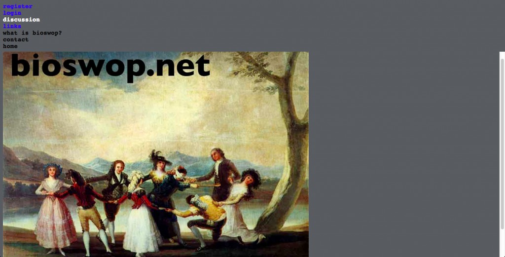 Bioswop is a cv-exchange platform. The idea is to provide curriculum vitae, bios, resumés for people to use and borrow. With a list of several institutions, the assembly of a CV is possible without utilising existing CVs. The assembled or borrowed CV can be downloaded as a pdf file. It will carry a footnote 'this CV was borrowed through www.bioswop.net'. The project is entirely based on trust and involves no monetary exchange.