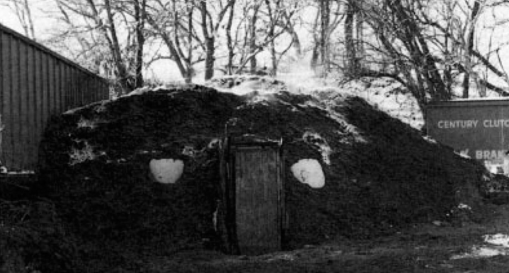 Temporary shelter for homeless in the winter, using organic material to produce heat.