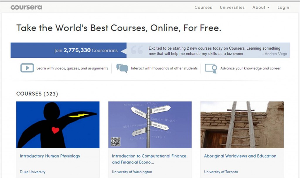 Coursera creates accessible education and a global classroom. It offers courses in a wide range of topics, spanning the Humanities, Medicine, Biology, Social Sciences, Mathematics, Business, Computer Science, and many others, all for free.