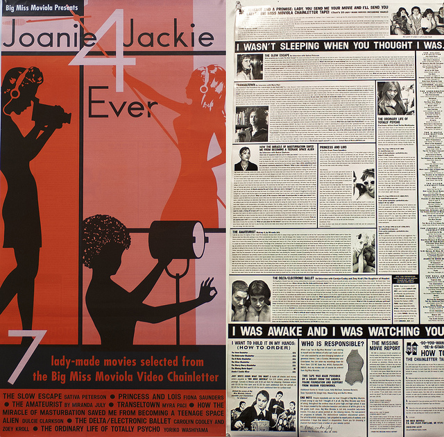 Joanie 4 Jackie is a female network of chain-letters to share and promote independent films. These films are compiled onto video tapes which each contain 10 short films made by women from North America, Europe and Australia. The participants can use the medium that they prefer to make the videos, and also the choice of topics is open. Every tape is sent to participants or offered for sale. The compilations are also screened at film festivals and DIY movie screening.