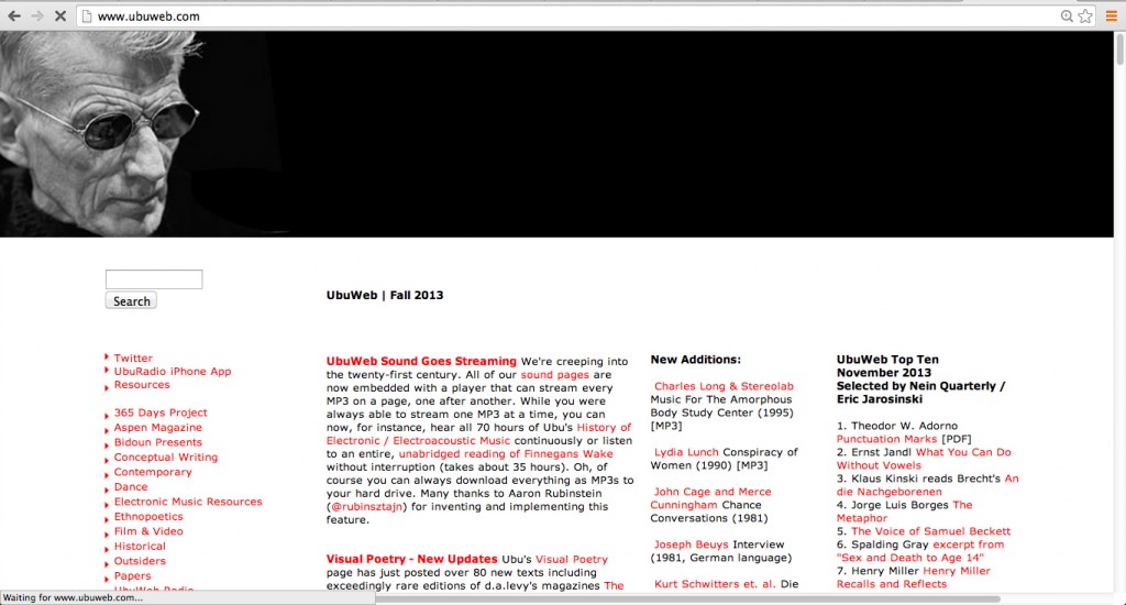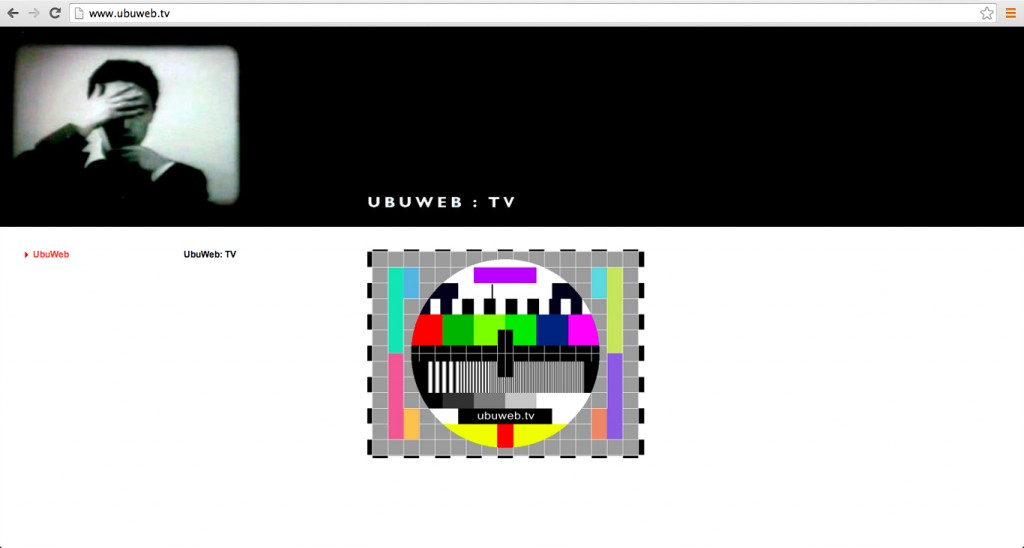 Ubuweb was founded in response to the marginal distribution of avant garde material (cinema-art sound and mp3 files). It is an online platform where hundreds of videos and films can be viewed free of charge. Material is provided by film makers or is placed online by UBU web, without artists’ permission.