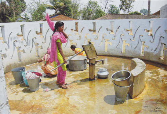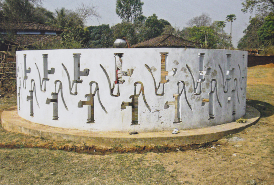 Water pump in the Indian village of Kopaweda, formed by a pump surrounded by a muddy pool, emerged as a central meting point for women in the village and nexus of daily activity, essential to daily survival. After lengthy dialogue plans for free for restructuring the pump sites. In 2001 the first water pump structure was built or Nalpar site, consisting of a smooth concrete pad, a more efficient pump design, an enclosure incorporating Adivasi cultural symbols and a system of paved trenches to channel the water and collect it into smaller reservoirs. The sites operates on a more practical, ergonomic level and the construction was undertaken collaboratively.